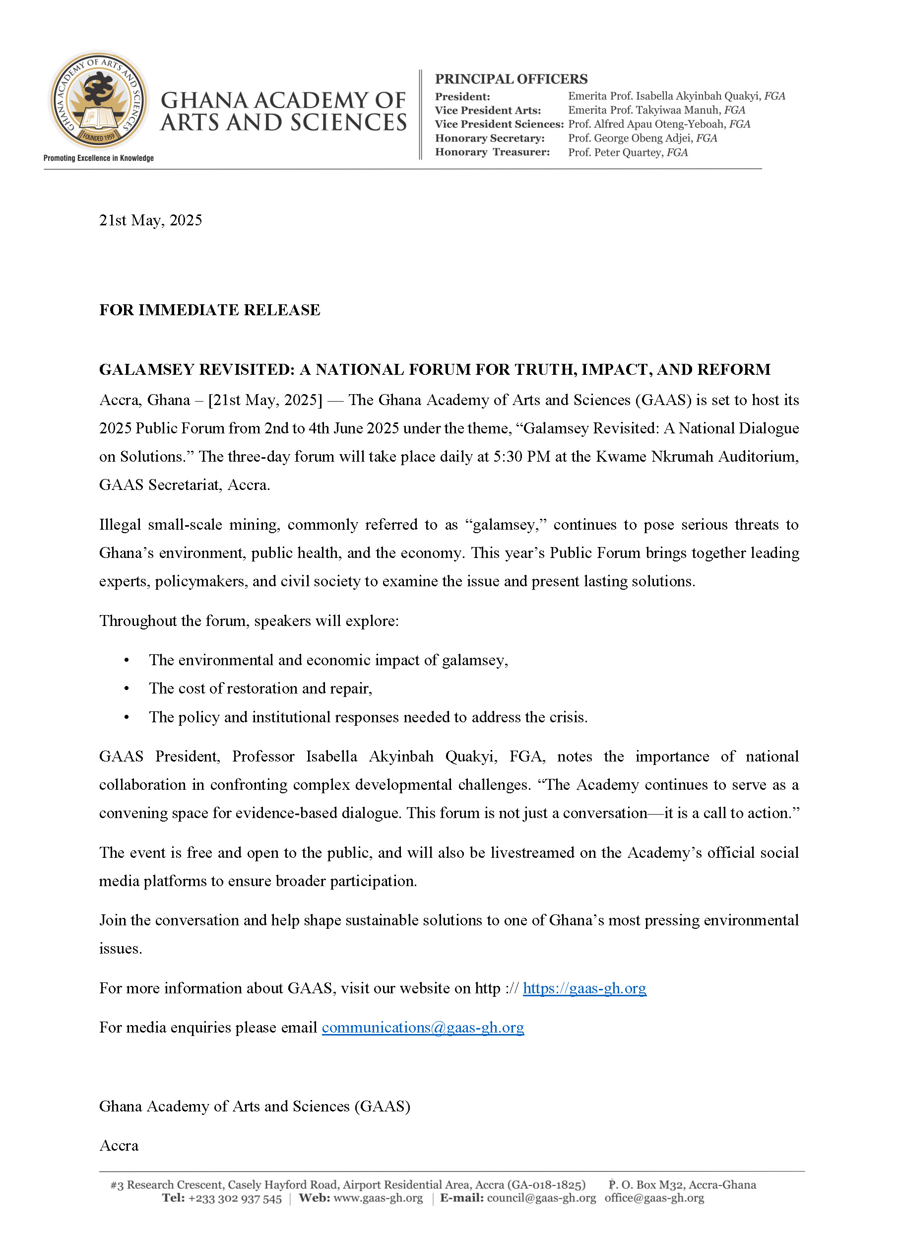 The Ghana Academy of Arts and Sciences was founded in 1959 on the initiative of Ghana’s first president, Osagyefo Dr Kwame Nkrumah. Its aim is generally to promote the pursuit, advancement and dissemination of knowledge in all branches of the sciences and the humanities.